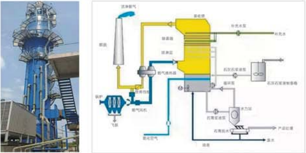 烟气进入脱硫装置的湿式吸收塔,与自上而下喷淋的碱性石灰石浆液雾滴逆流接触,其中的酸性氧化物SO,以及其他污染物HCL、HF等被吸收,烟气得以充分净化;吸收SO,后的浆液反应生成CaSO,,通过就地强制氧化、结晶生成 CaSO·2H,O,经脱水后得到商品级脱硫副产品一石膏,最终实现含硫烟气的综合治理。