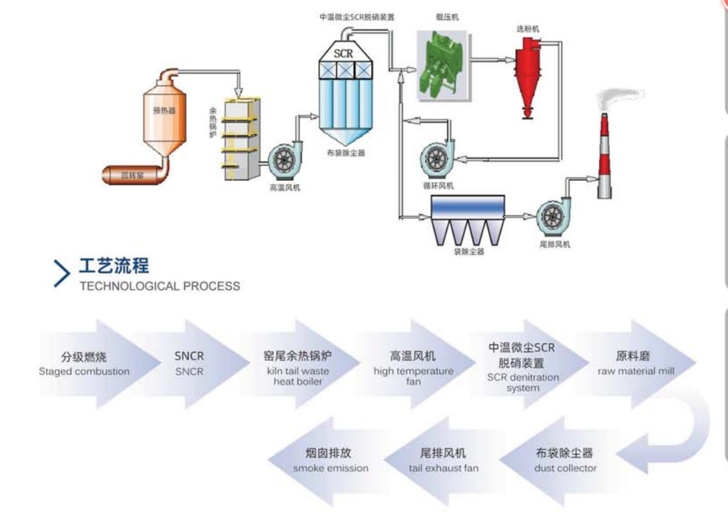 中温微尘SCR脱硝装置将布袋除尘器和SCR及原位自激活装置设计形成一体化装置,安装在余热锅炉后面催化剂反应温度170-230℃,脱硝效率95%以上。实现了水泥窑氮氧化物和粉尘颗粒物的高效处理,颗粒物≤5mg/m、氮氧化物≤50mg/m³、氨逃逸≤2.5mg/m³达到超低排放要求,同时脱硝氨水用量降低约75%,每年可降低氮氧化物排污总量约1100吨,解决了催化剂堵塞等。