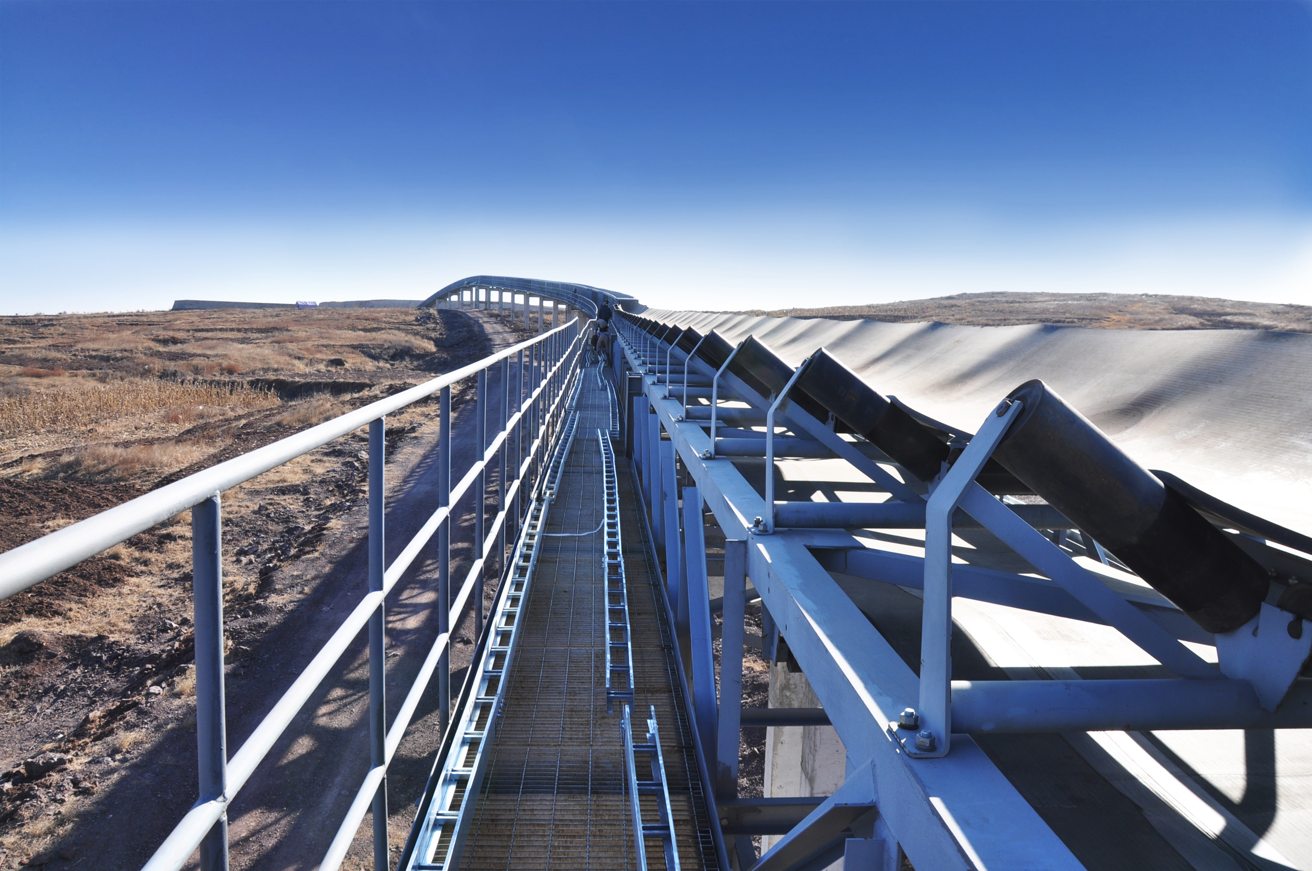 长距离曲线带式输送机可根据不同的输送工艺要求,按照不同的地形、走势、工况进行选型设计,我公司已实现单机最长输送距离15kM、最大功率3x1750kW、最大输送量7500t/h、最大带强4500N/mm、最大带宽2200mm。