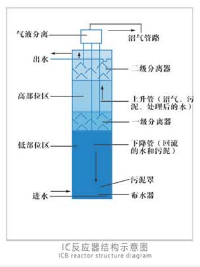 IC厌氧反应器是在上流式厌氧污泥床(UASB)反应器的研究成果的基础上,研发的第三代超高效厌氧反应器。该反应器通过采用两级三相分离器将反应器划分为下部的高负荷区和上部的低负荷区,依靠沼气在升流管和回流管间产生的密度差在反应器内部形成流体循环,从而强化了污水与厌氧颗粒污泥的接触,使废水得以快速净化的一种高效厌氧反应器。IC厌氧反应器具有占地少、容积负荷高、抗冲击能力强、性能稳定、产气量大、操作管理简单、运行成本低、经济效益明显等特点,更适合于中高浓度污水处理工程中。